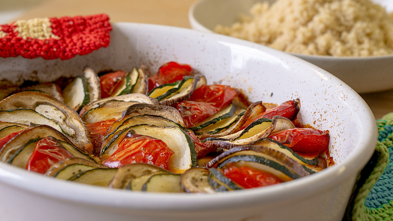 Etwa die Hälfte der Tomatensoße in einer Auflaufform verteilen, das geschnittene Gemüse darüber schichten und die restliche Tomatensoße darauf verteilen.